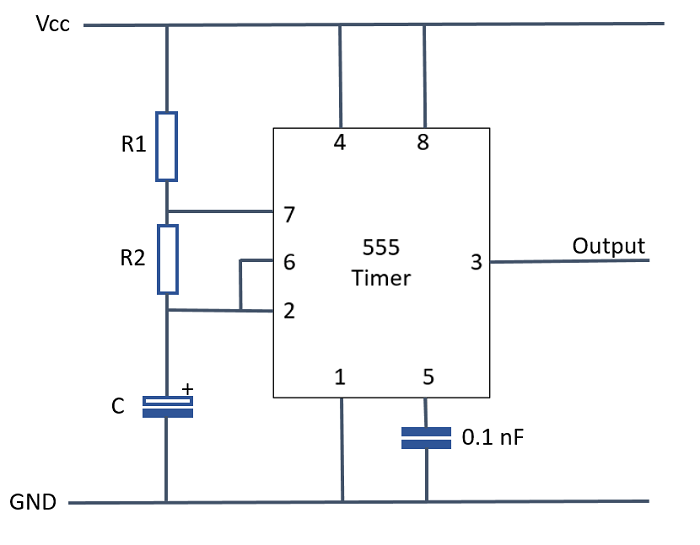 Compute R1, R2, and C for a 555 in astable mode. You can choose to compute values with 5%-25% accuracy from the specified target (frequency and duty-cycle). Duty-cycles should be at least 50% or higher.